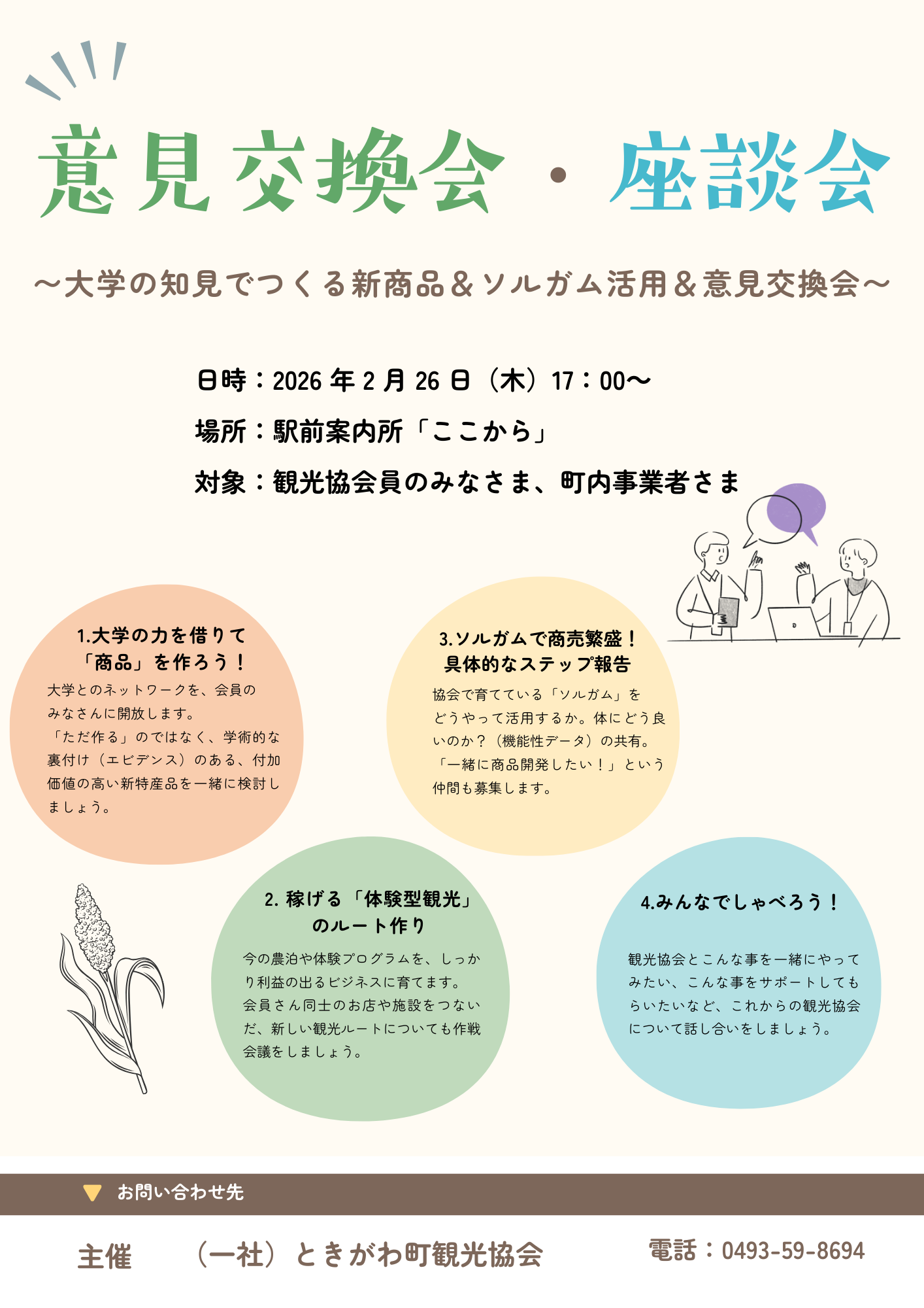 そこで、観光協会会員の皆さま、また町内の各事業者さまを対象に、ソルガムの新商品や活用についての意見交換会を開催することとなりました。